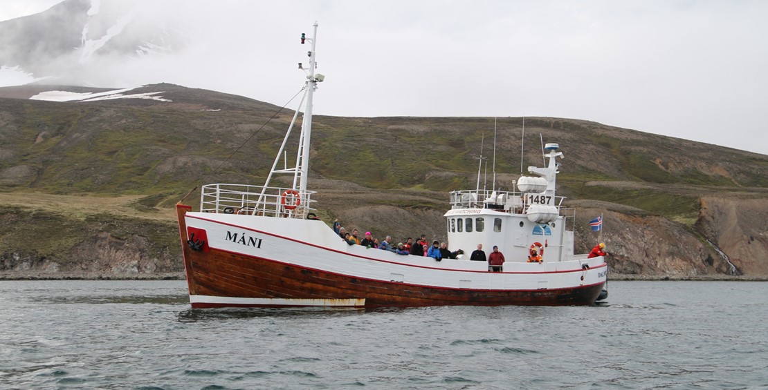 Máni is a traditional Icelandic fishing boat built from oak and as such extremely strong and heavy, providing slow movements on the water. In Iceland there is always a little romance about those old fishing boats. They are beautiful and if it wasn´t for the whale watching companies renovating and operating them, they would be left to rot in docks around Iceland. The oak boats depend on being used, getting wet as it keeps the oak planks tight together, as wet timber expands but dry shrinks.